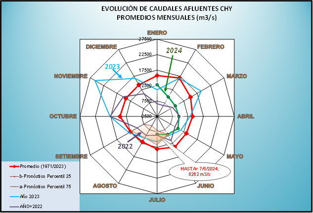 El caudal afluente a la CHY diario, pronosticado para la fecha de hoy es de 8.600 m3/s, y para el día de mañana se espera una afluencia del orden de 8.400 m3/s.