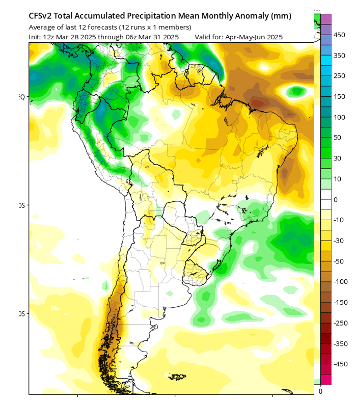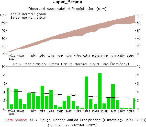 Para el trimestre considerado, se prevén valores infeiores a la normal en gran parte de la región oriental, mientras que en el resto del territorio nacional, se esperan condiciones normales.