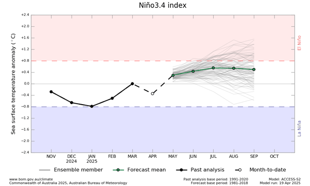 El modelo de la Oficina sugiere que es probable que las temperaturas de la superficie del mar permanezcan dentro de los umbrales neutrales del ENSO (-0,8 °C a +0,8 °C) durante todo el período de pronóstico hasta febrero de 2025.