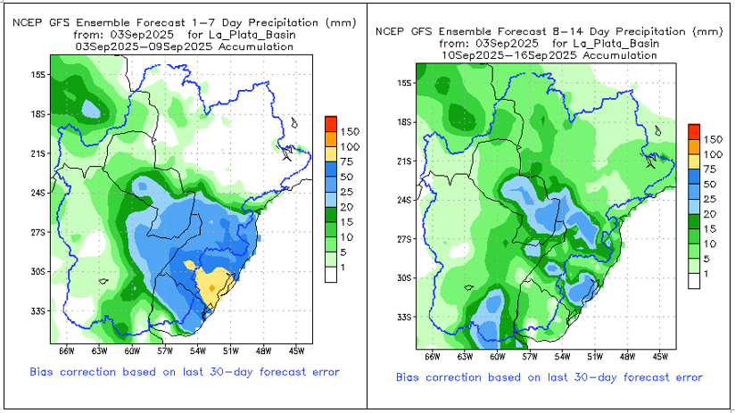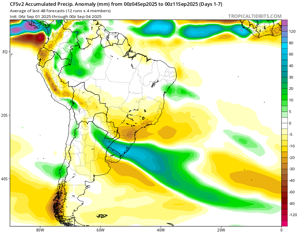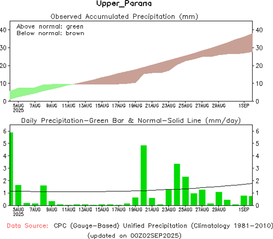 El fenómeno de El Niño-Oscilación del Sur (ENOS) se mantiene neutral. El último valor de Niño3.4 para la semana que finalizó el 24 de agosto es de -0,28 °C. Los valores neutrales de ENOS para Niño3.4 se encuentran entre -0,8 °C y +0,8 °C. Si bien las aguas subsuperficiales del Pacífico tropical han mostrado signos de enfriamiento en las últimas semanas, los indicadores atmosféricos se mantienen mayormente neutrales.