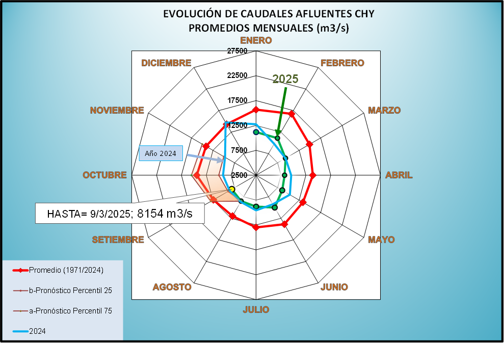 El caudal afluente a la CHY diario, pronosticado para la fecha de hoy es de 8.600 m3/s, y para el día de mañana se espera una afluencia del orden de 9.000 m3/s.