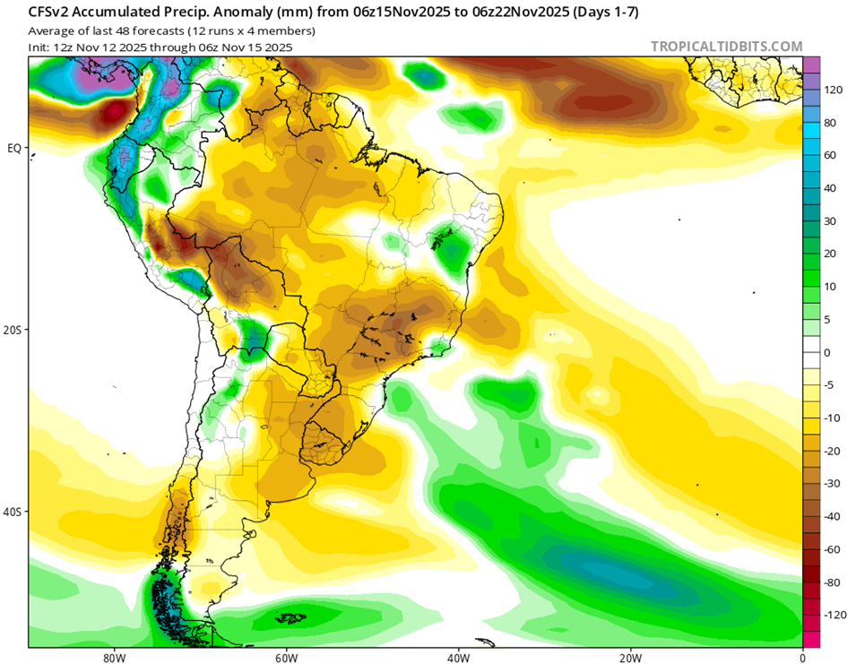 El índice del Modo Anular del Sur (SAM) es negativo al 25 de octubre. Se prevé que aumente en los próximos días hasta alcanzar niveles neutrales y que se mantenga así durante al menos las próximas dos semanas.