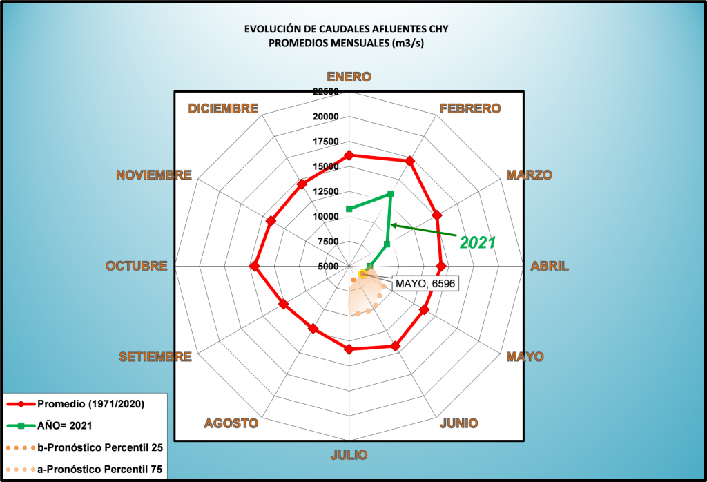 El caudal afluente a la CHY diario, pronosticado para la fecha de hoy es de 6.500 m3/s, y para el día de mañana se espera una afluencia del orden de 6.400 m3/s.