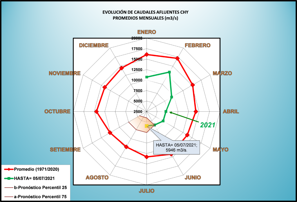 El caudal afluente a la CHY diario, pronosticado para la fecha de hoy es de 5.300 m3/s, y para el día de mañana se espera una afluencia del orden de 5.400 m3/s.