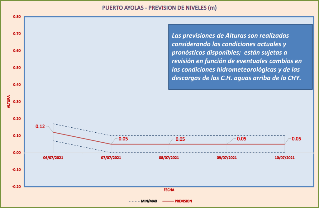 Las previsiones de Alturas son realizadas considerando las condiciones actuales y pronósticos disponibles y están sujetas a revisión en función de eventuales cambios en las condiciones hidrometeorológicas y de las descargas de las C.H. aguas arriba de la CHY.