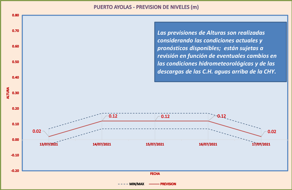 Las previsiones de Alturas son realizadas considerando las condiciones actuales y pronósticos disponibles y están sujetas a revisión en función de eventuales cambios en las condiciones hidrometeorológicas y de las descargas de las C.H. aguas arriba de la CHY.