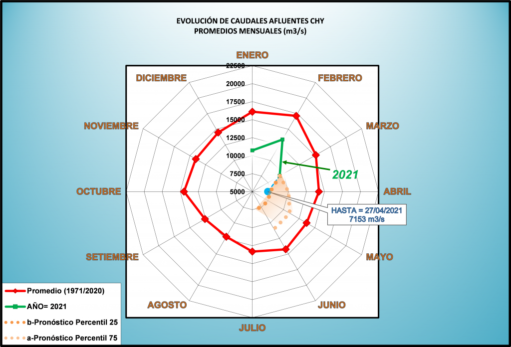 El caudal afluente a la CHY diario, pronosticado para la fecha de hoy es de 6.600 m3/s, y para el día de mañana se espera una afluencia del orden de 6.500 m3/s.