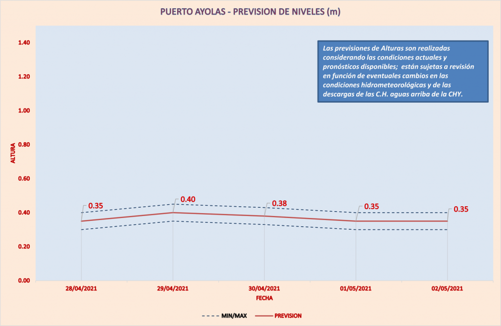 Las previsiones de Alturas son realizadas considerando las condiciones actuales y pronósticos disponibles y están sujetas a revisión en función de eventuales cambios en las condiciones hidrometeorológicas y de las descargas de las C.H. aguas arriba de la CHY.
