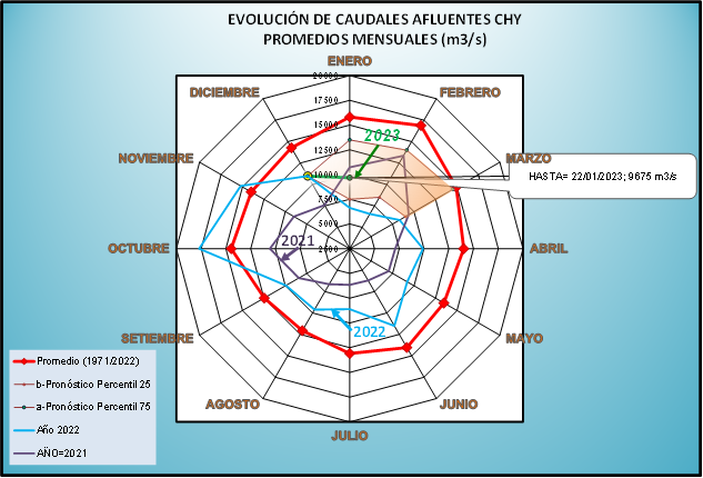 Para el pronóstico hidrológico se considera la programación energética y las previsiones de caudales afluentes (medias diarias) que son realizadas teniendo en cuenta las condiciones actuales y pronósticos disponibles, que además están sujetas a revisión en función de eventuales cambios en las condiciones hidrometeorológicas (además de fenómenos localizados como el viento que se traduce en oleaje) y de las descargas de las Centrales Hidroeléctricas aguas arriba de la CHY.