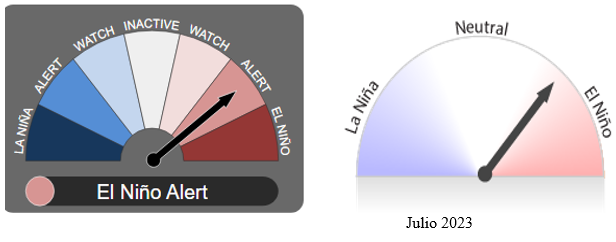 La Perspectiva ENSO está en Alerta El Niño. Cuando los criterios de Alerta de El Niño se han cumplido en el pasado, un evento de El Niño se ha desarrollado alrededor del 70% del tiempo.