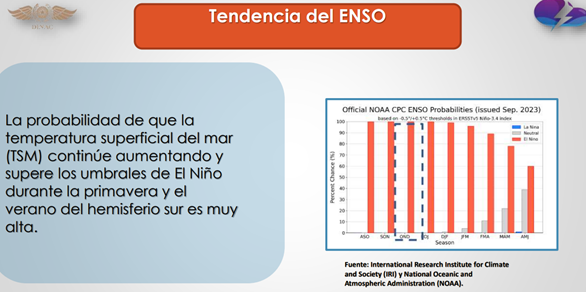 La evolución de índices climáticos publicados por organismos especializados de referencia, vinculados con la previsión del fenómeno caracterizado como “El Niño”, hace prever con un grado de probabilidad alto, que durante el semestre octubre 23 – marzo 24 podrían verificarse eventos hidrológicos asociados a situaciones de aguas altas.