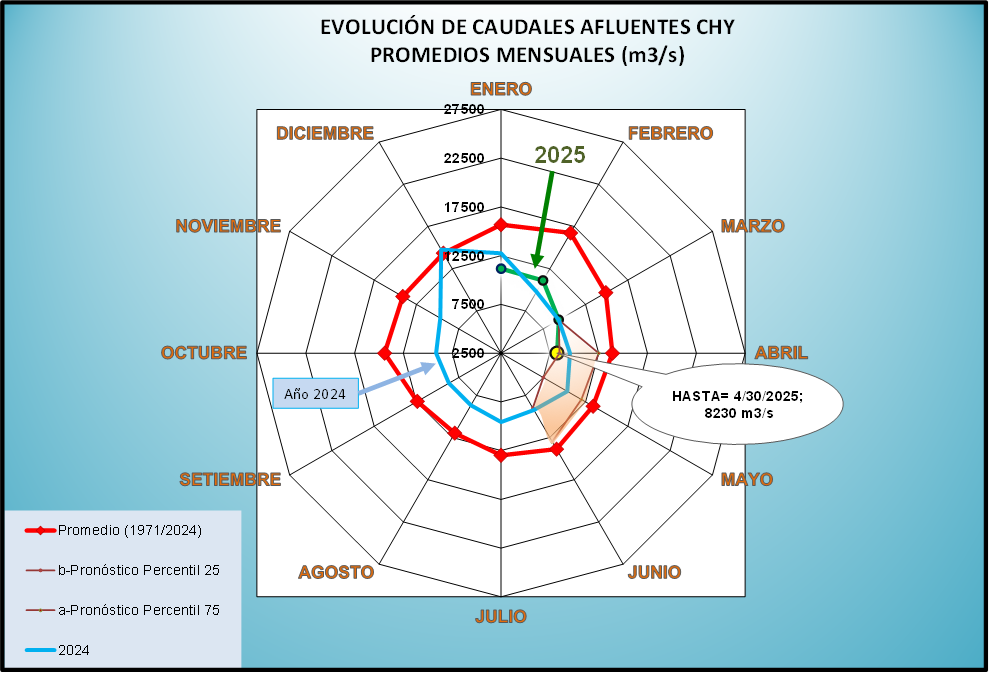 El caudal afluente a la CHY diario, pronosticado para la fecha de hoy es de 8.800 m3/s, y para el día de mañana se espera una afluencia del orden de 8.100 m3/s.