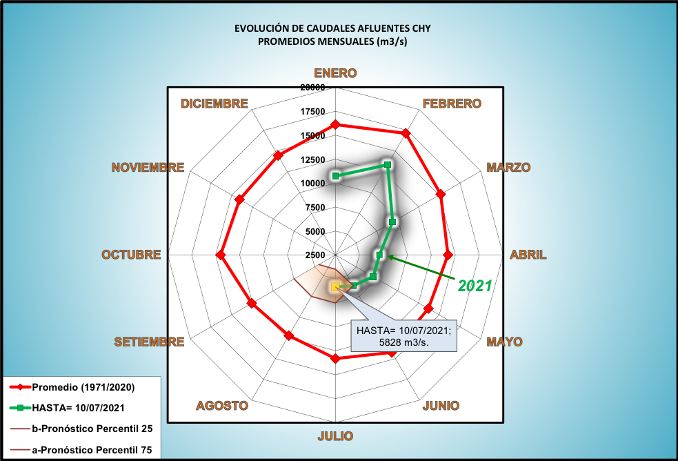 El caudal afluente a la CHY diario, pronosticado para la fecha de hoy es de 5.800 m3/s, y para el día de mañana se espera una afluencia del orden de 5.500 m3/s.