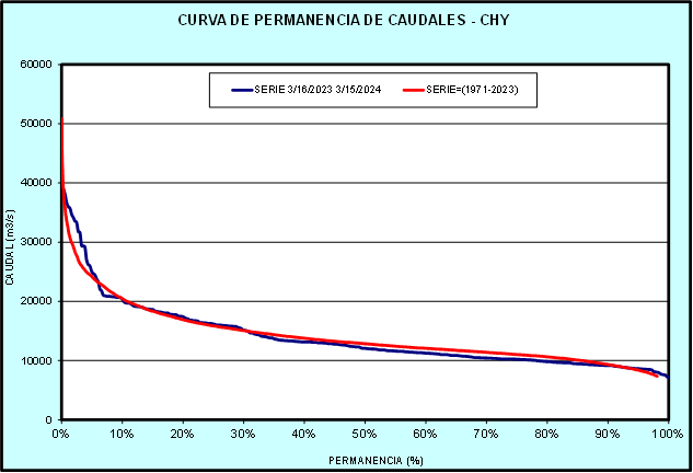 El caudal afluente a la CHY diario, pronosticado para la fecha de hoy es de 9.800 m3/s, y para el día de mañana se espera una afluencia del orden de 9.500 m3/s.