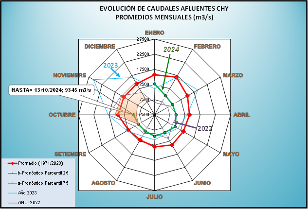 El caudal afluente a la CHY diario, pronosticado para la fecha de hoy es de 8.500 m3/s, y para el día de mañana se espera una afluencia del orden de 8.800 m3/s.