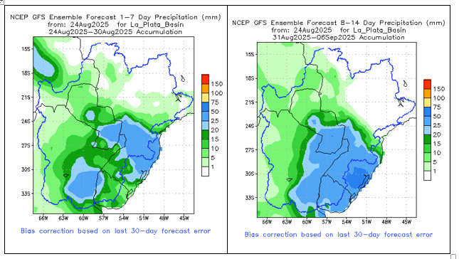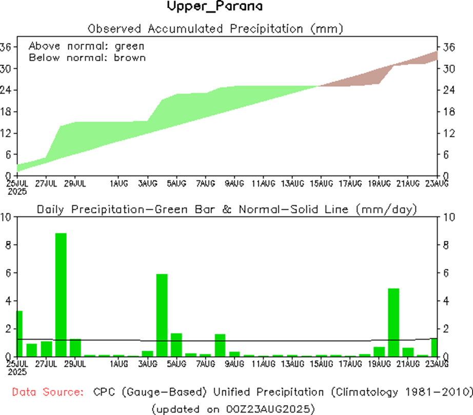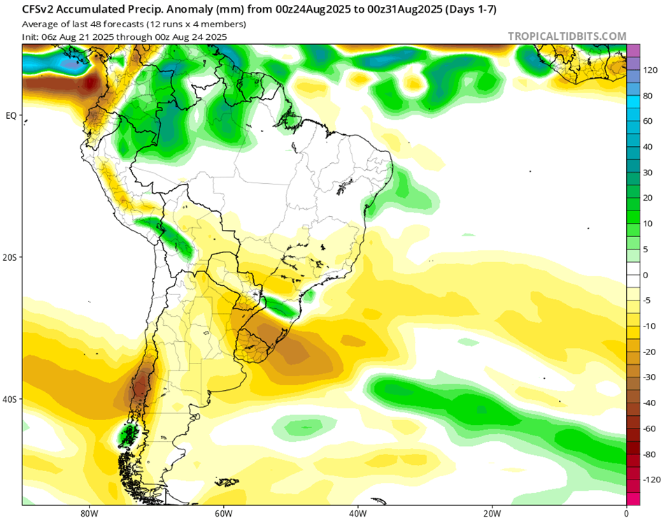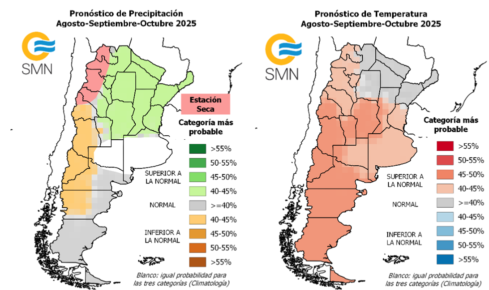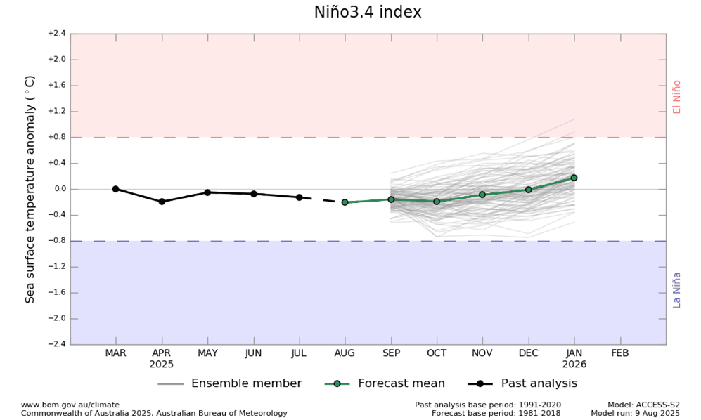 El fenómeno de El Niño-Oscilación del Sur (ENOS) se mantiene neutral. El último valor de El Niño 3.4 para la semana que finalizó el 10 de agosto es de -0,12 °C. Los valores neutrales de El Niño 3.4 se encuentran entre -0,8 °C y +0,8 °C.