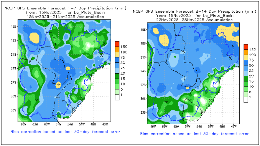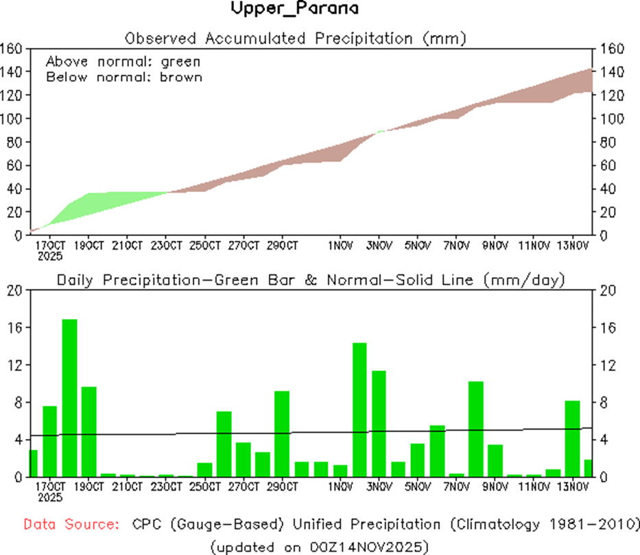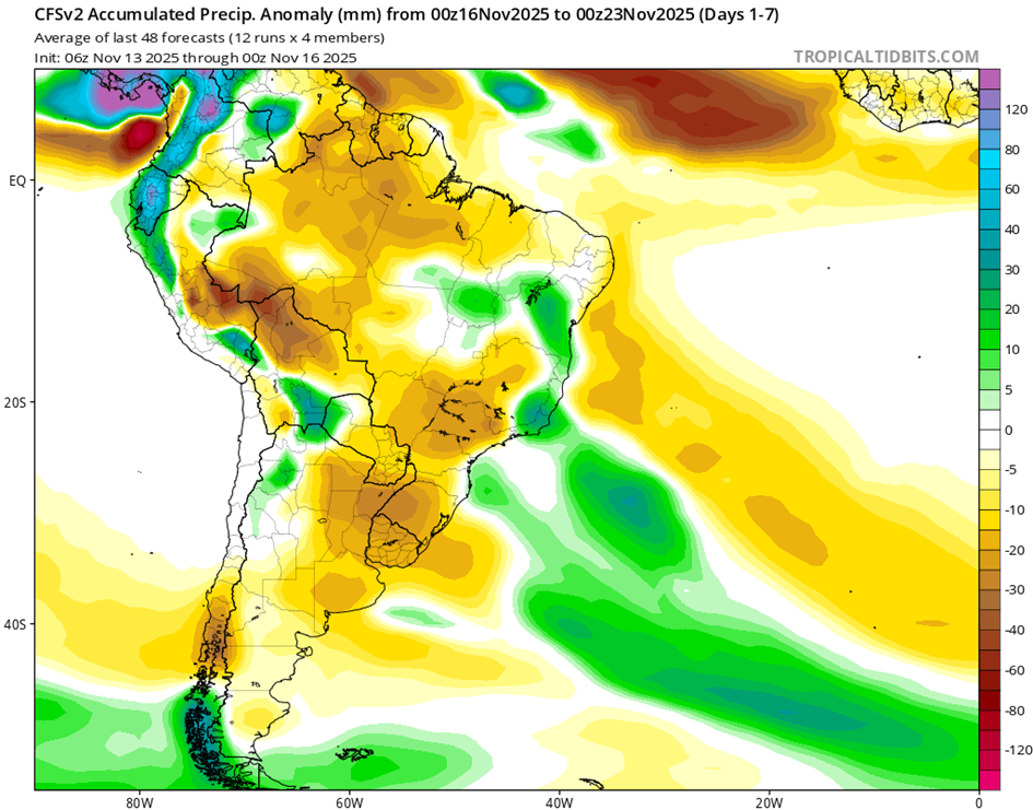 El índice del Modo Anular del Sur (SAM) es negativo al 25 de octubre. Se prevé que aumente en los próximos días hasta alcanzar niveles neutrales y que se mantenga así durante al menos las próximas dos semanas.