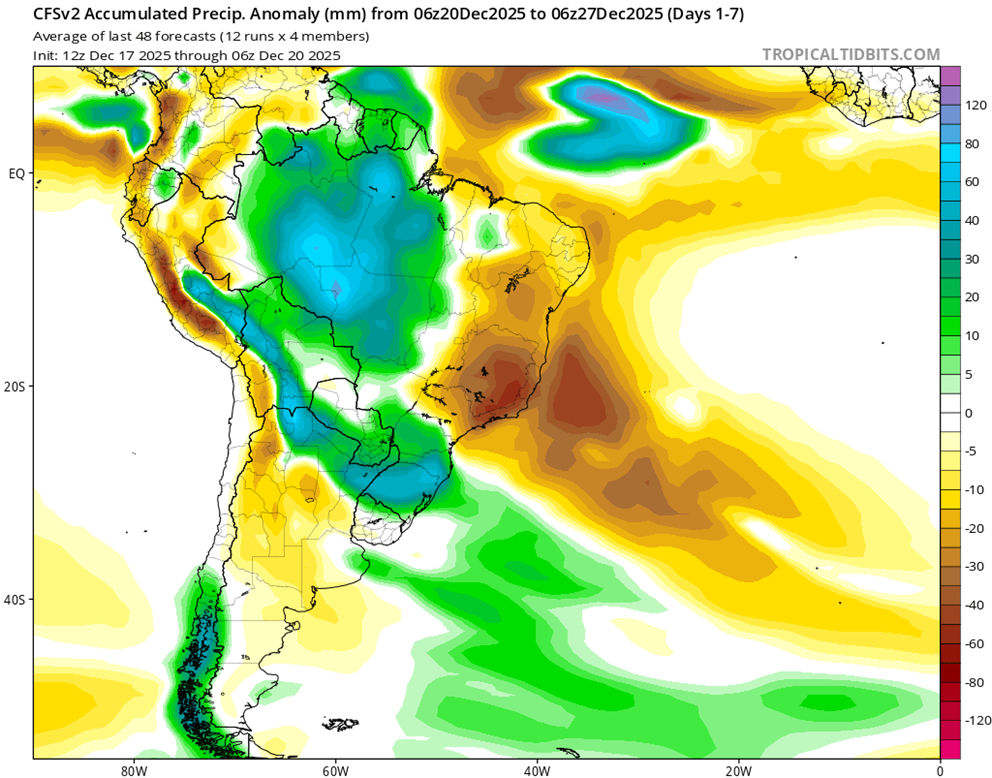 • La Niña está en curso en el Pacífico tropical. Hay indicios de que el océano Pacífico tropical y la atmósfera están acoplados, lo que significa que actualmente actúan para reforzar y mantener el patrón de La Niña. El último valor relativo del índice de temperatura de la superficie del mar (TSM) Niño3.4 para la semana que finalizó el 7 de diciembre de 2025 es de -0,74 °C. Los valores sostenidos por debajo de -0,80 °C son consistentes con un patrón de La Niña. Los valores semanales del índice relativo Niño3.4 han fluctuado alrededor del umbral de La Niña desde mediados hasta finales de septiembre.