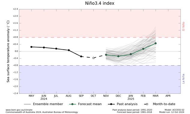 El modelo de la Oficina sugiere que es probable que las temperaturas de la superficie del mar permanezcan dentro de los umbrales neutrales del ENSO (-0,8 °C a +0,8 °C) durante todo el período de pronóstico hasta febrero de 2025.