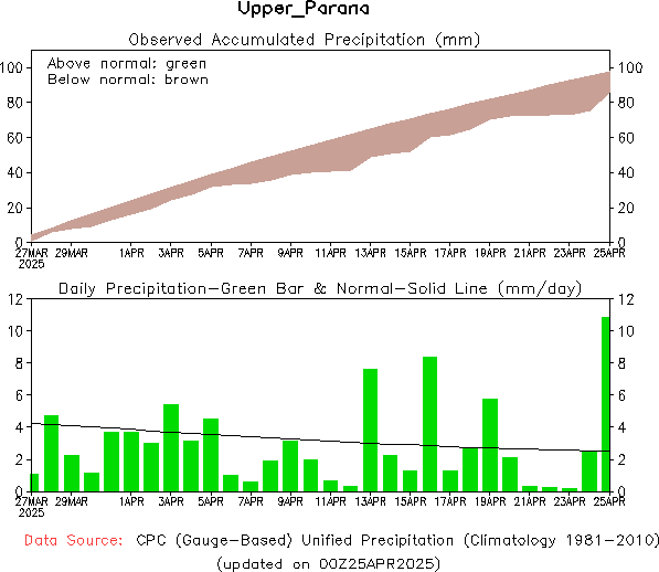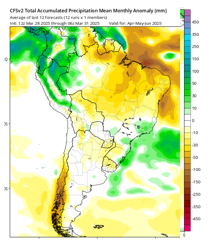Para el trimestre considerado, se prevén valores inferiores a la normal en gran parte de la región oriental, mientras que en el resto del territorio nacional, se esperan condiciones normales.