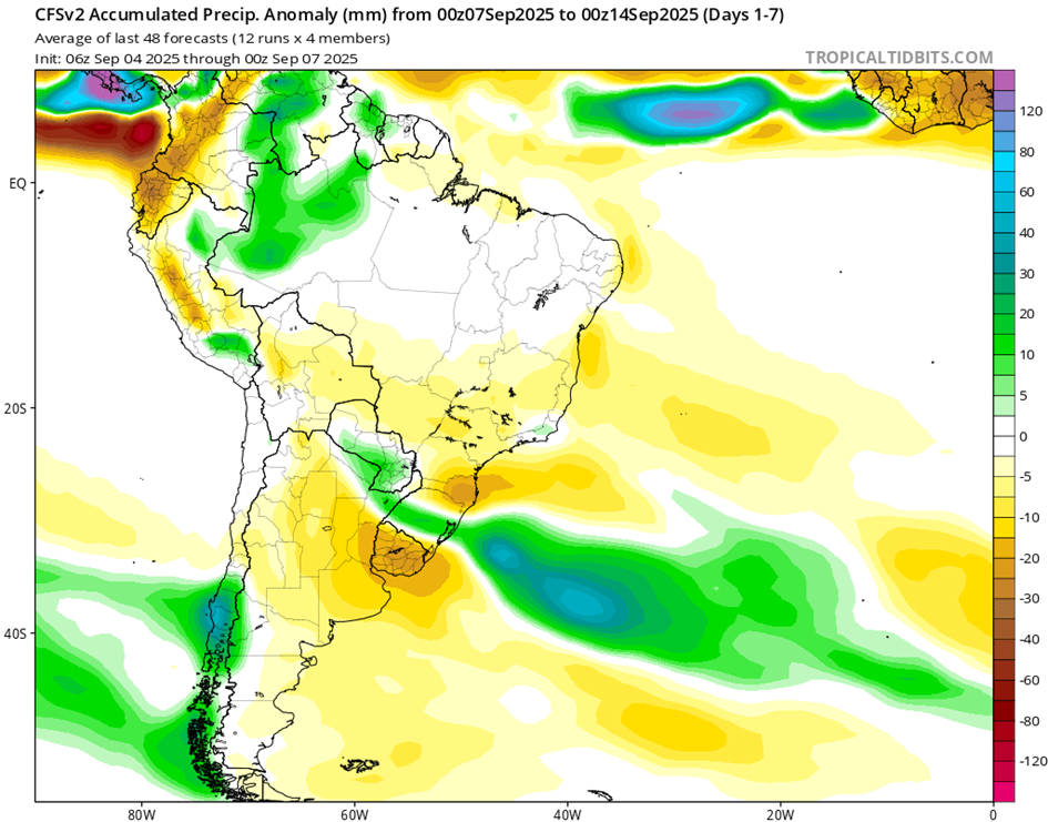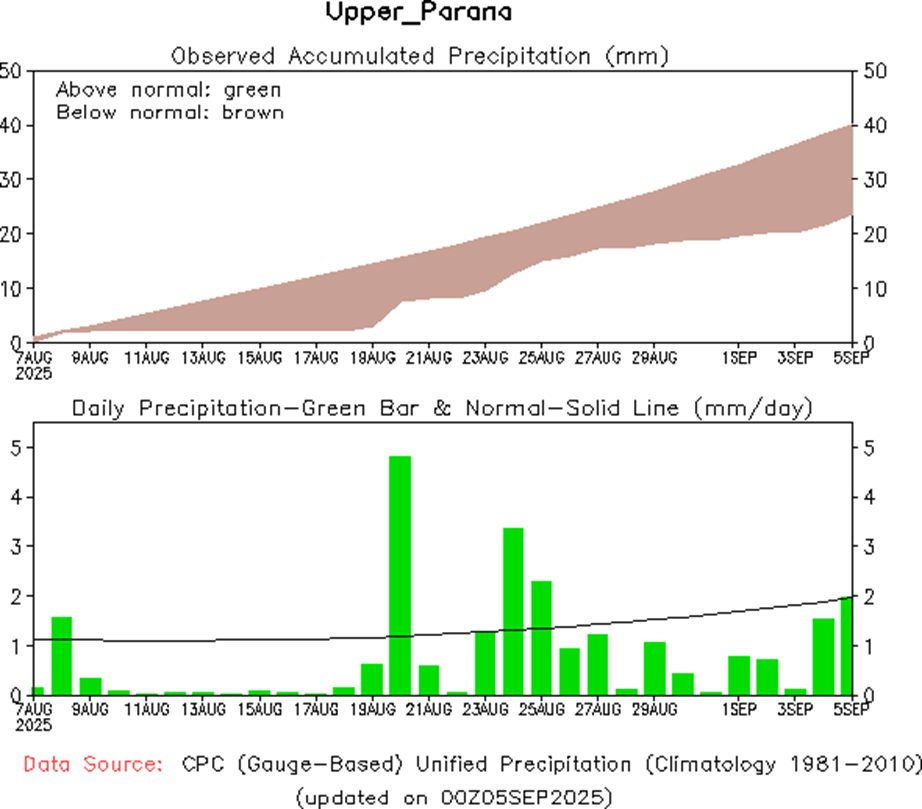 El fenómeno de El Niño-Oscilación del Sur (ENOS) se mantiene neutral. El último valor de Niño3.4 para la semana que finalizó el 24 de agosto es de -0,28 °C. Los valores neutrales de ENOS para Niño3.4 se encuentran entre -0,8 °C y +0,8 °C. Si bien las aguas subsuperficiales del Pacífico tropical han mostrado signos de enfriamiento en las últimas semanas, los indicadores atmosféricos se mantienen mayormente neutrales.