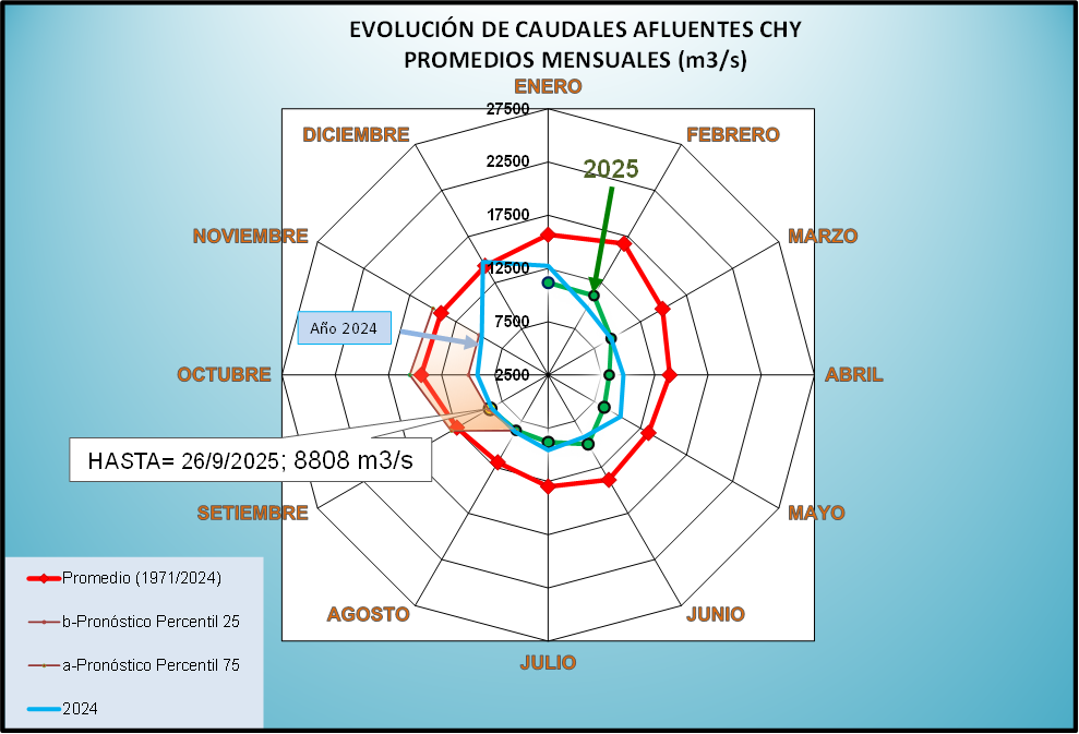 El caudal afluente a la CHY diario, pronosticado para la fecha de hoy es de 8.200 m3/s, y para el día de mañana se espera una afluencia del orden de 8.700 m3/s.