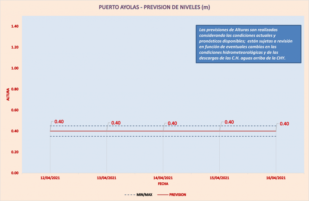 Las previsiones de Alturas son realizadas considerando las condiciones actuales y pronósticos disponibles y están sujetas a revisión en función de eventuales cambios en las condiciones hidrometeorológicas y de las descargas de las C.H. aguas arriba de la CHY.