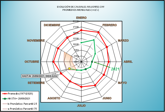 El caudal afluente a la CHY diario, pronosticado para la fecha de hoy es de 8.200 m3/s, y para el día de mañana se espera una afluencia del orden de 8.500 m3/s.