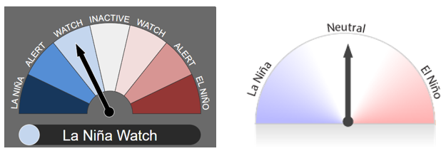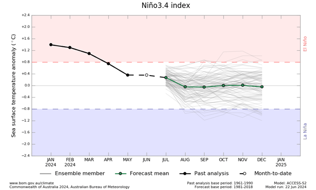 La Perspectiva ENSO se encuentra actualmente en ‘Vigilancia de La Niña’, lo que significa que hay algunas señales de que La Niña podría formarse en el Océano Pacífico más adelante en 2024. Los indicadores atmosféricos y oceánicos se encuentran actualmente dentro de los umbrales neutrales de ENSO.