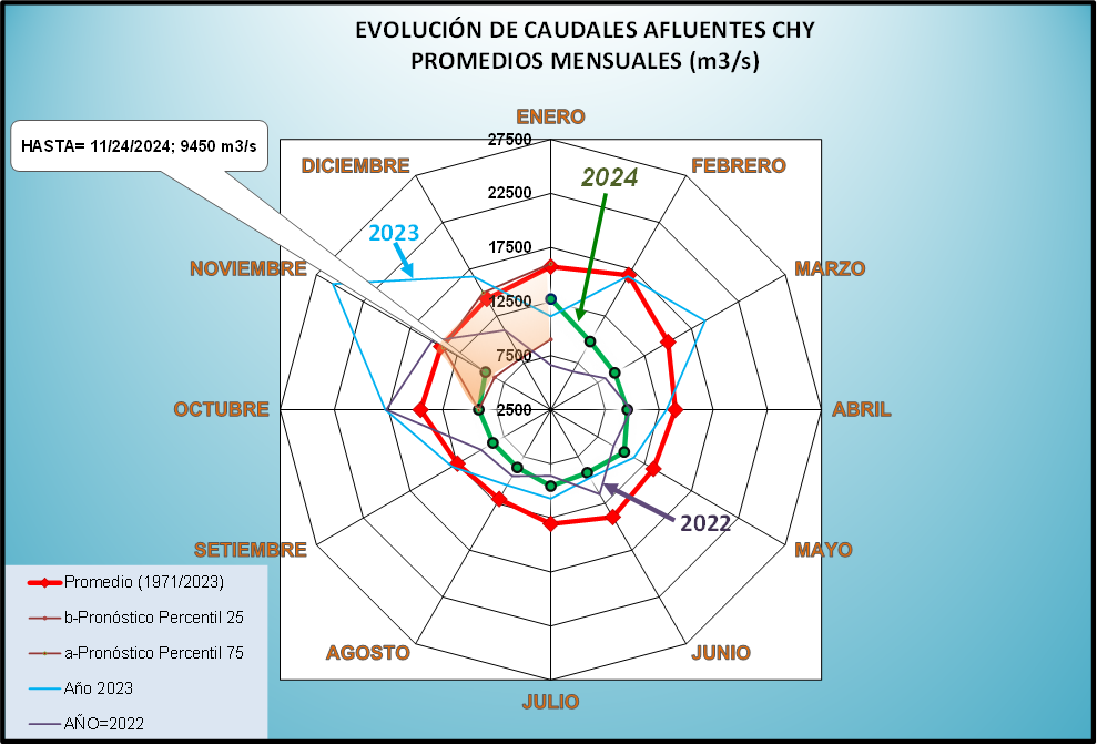 El caudal afluente a la CHY diario, pronosticado para la fecha de hoy es de 10.100 m3/s, y para el día de mañana se espera una afluencia del orden de 9.200 m3/s.