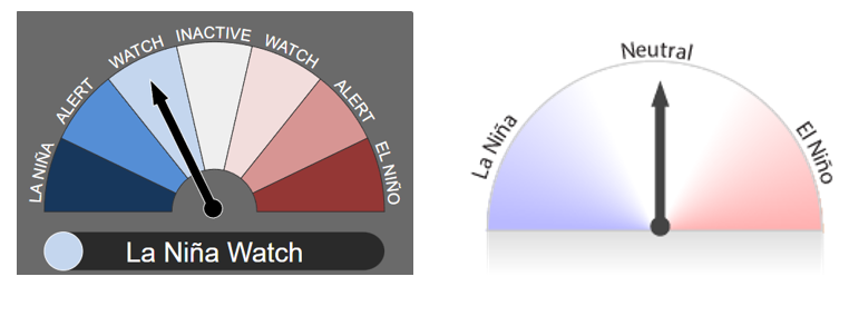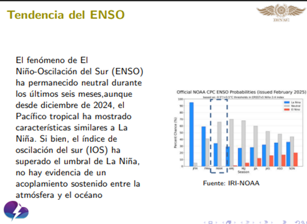 El fenómeno de El Niño-Oscilación del Sur (ENSO) es neutro, y tanto las temperaturas superficiales del mar (TSM) en el Océano Pacífico ecuatorial central como los patrones atmosféricos se encuentran en niveles neutros respecto de El Niño. Los índices atmosféricos, como los relacionados con los patrones de presión superficial, nubes y vientos alisios, son en general consistentes con un estado neutro respecto de El Niño. Aunque algunos han mostrado señales similares a las de La Niña durante las últimas semanas, estas señales no han sido consistentes.