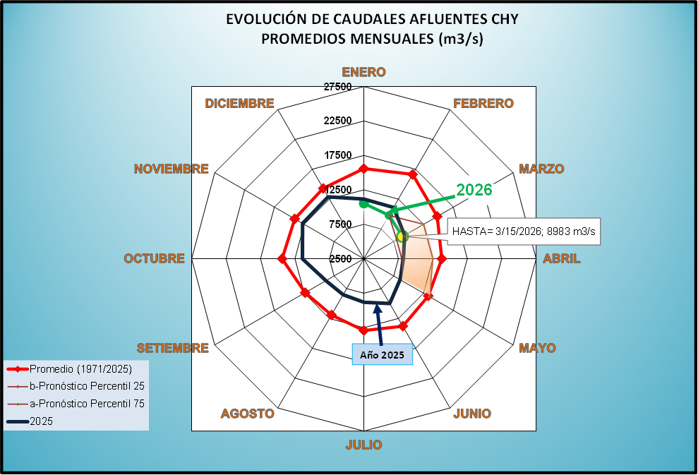 El caudal afluente a la CHY diario, pronosticado para la fecha de hoy es de 8.500 m3/s, y para el día de mañana se espera una afluencia del orden de 7.900 m3/s.