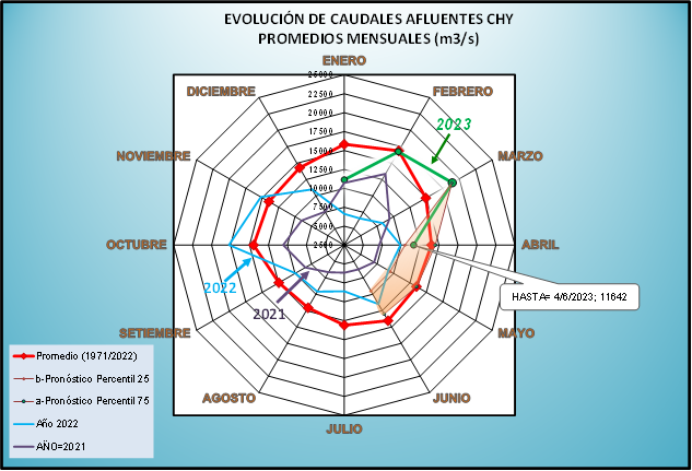 El caudal afluente a la CHY diario, pronosticado para la fecha de hoy es de 10.300 m3/s, y para el día de mañana se espera una afluencia del orden de 9.700 m3/s.