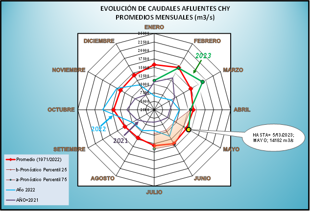 El caudal afluente a la CHY diario, pronosticado para la fecha de hoy es de 11.300 m3/s, y para el día de mañana se espera una afluencia del orden de 10.600 m3/s.