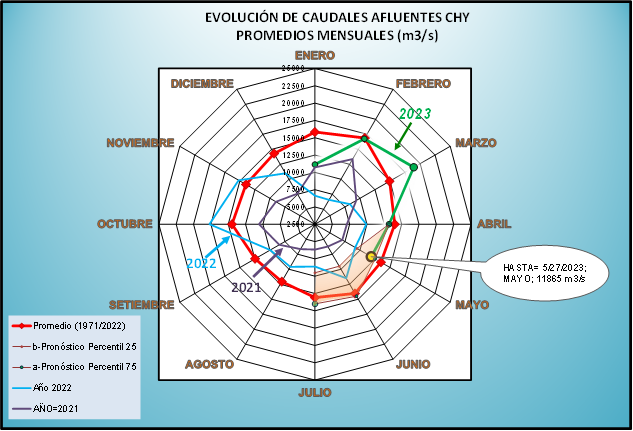 El caudal afluente a la CHY diario, pronosticado para la fecha de hoy es de 8.600 m3/s, y para el día de mañana se espera una afluencia del orden de 8.200 m3/s.