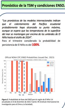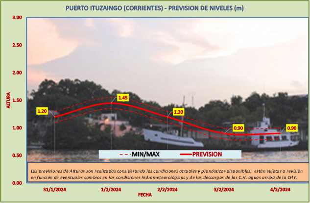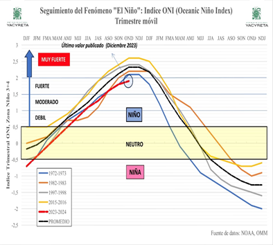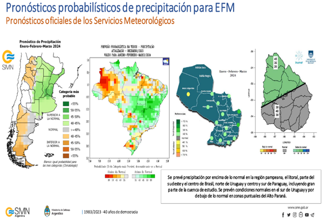 La evolución de índices climáticos publicados por organismos especializados de referencia, vinculados con la previsión del fenómeno caracterizado como “El Niño”, hace prever con un grado de probabilidad alto, que durante el periodo enero y marzo 2024 podrían verificarse eventos hidrológicos asociados a situaciones de aguas altas.