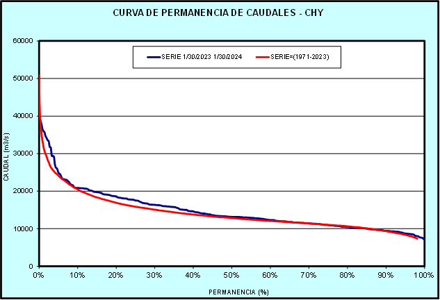 El caudal afluente a la CHY diario, pronosticado para la fecha de hoy es de 10.500 m3/s, y para el día de mañana se espera una afluencia del orden de 11.300 m3/s.