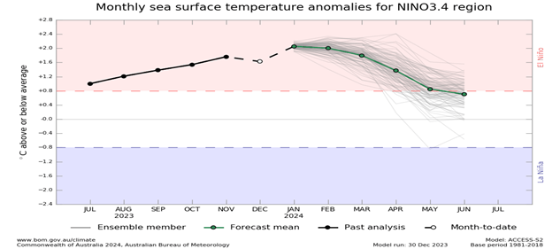 Los indicadores oceánicos muestran firmemente un estado de El Niño. Las temperaturas de la superficie del mar (TSM) del Pacífico central y oriental siguen superando los umbrales de El Niño. Los modelos indican que es probable que se produzca un mayor calentamiento del Pacífico central al oriental.