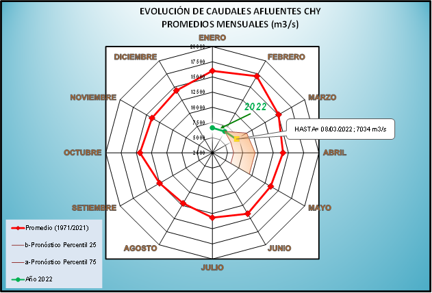 El caudal afluente a la CHY diario, pronosticado para la fecha de hoy es de 6.800 m3/s, y para el día de mañana se espera una afluencia del orden de 7.700 m3/s.