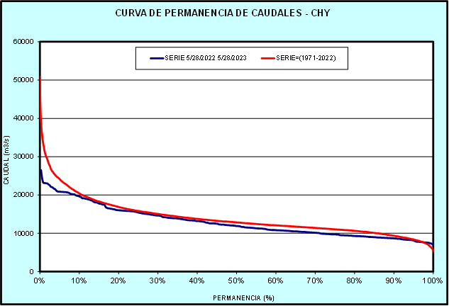 El caudal afluente a la CHY diario, pronosticado para la fecha de hoy es de 8.400 m3/s, y para el día de mañana se espera una afluencia del orden de 8.800 m3/s.