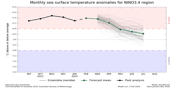 El Niño continúa en el Océano Pacífico tropical. Los pronósticos y las observaciones de los modelos indican que la temperatura de la superficie del mar en el Pacífico tropical central ha alcanzado su punto máximo y ahora está disminuyendo.