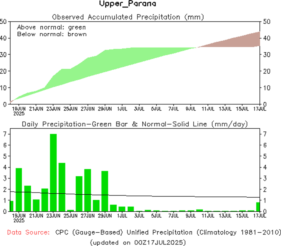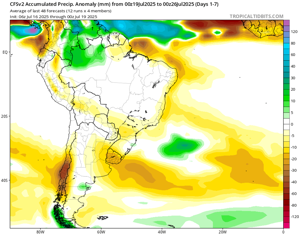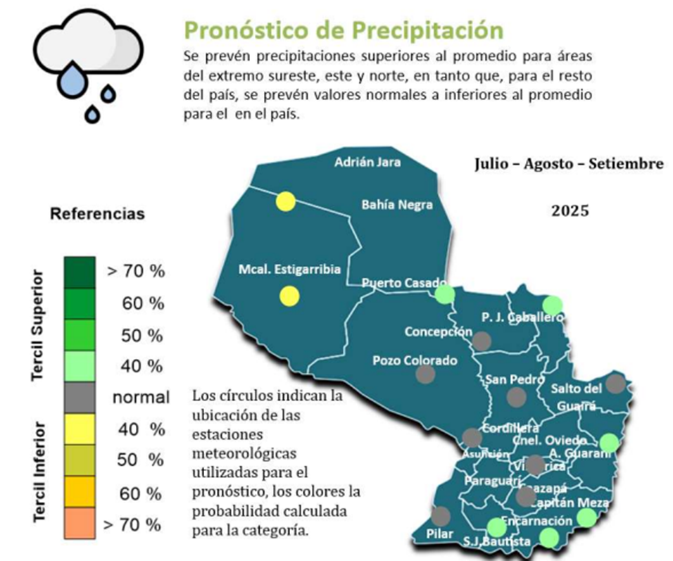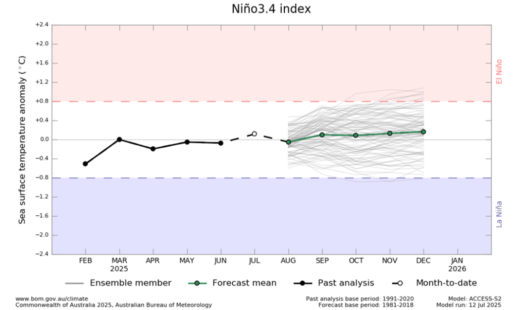 El fenómeno de El Niño-Oscilación del Sur (ENOS) es neutro. El último valor de Niño 3.4 para la semana que finalizó el 8 de junio fue de -0,07 °C. Los valores neutros de ENOS se encuentran entre -0,8 °C y +0,8 °C.
