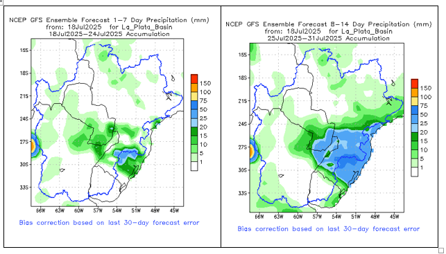 El pronóstico Hidrometeorológico del Centro Climático de referencia indica una tendencia semanal de poca significancia hidrológica en la cuenca de interés para la CHY con dispersión geográfica según sea la fuente consultada. (Ver gráfico Nro. 1).