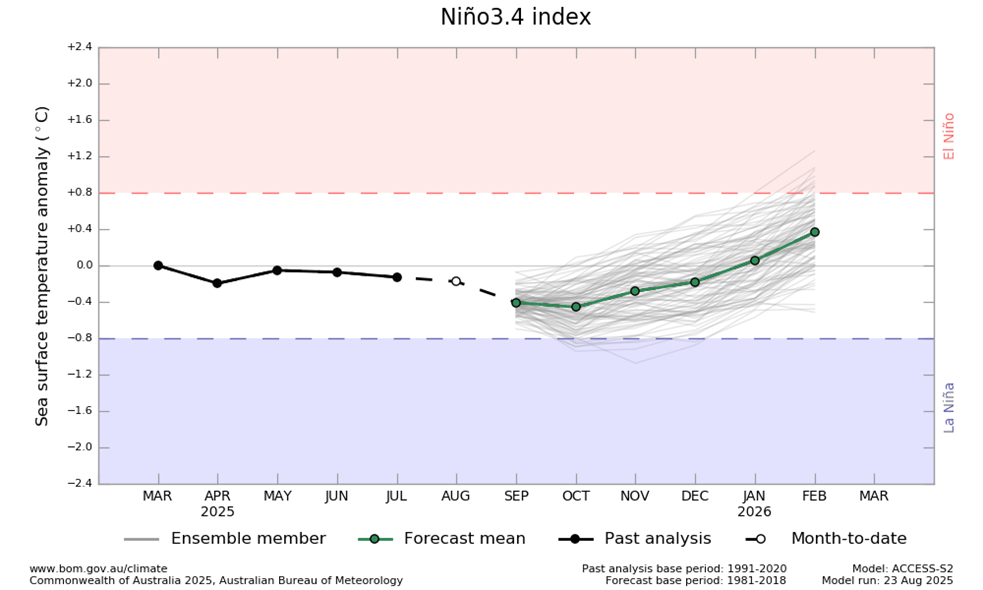 El modelo de la Oficina predice un ENSO neutral (ni El Niño ni La Niña) hasta al menos enero. Esto coincide con la mayoría de los modelos internacionales evaluados, aunque algunos indican la posibilidad de niveles limítrofes de La Niña. Existe una dispersión relativamente amplia en los pronósticos de los modelos, lo que indica mayor incertidumbre de lo habitual en el pronóstico del ENSO.