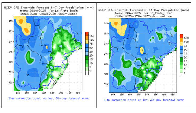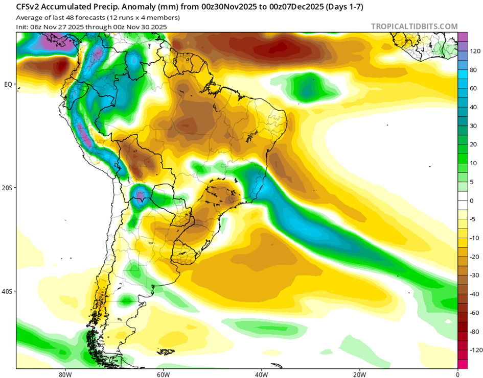 El índice del Modo Anular del Sur (SAM) es negativo al 25 de octubre. Se prevé que aumente en los próximos días hasta alcanzar niveles neutrales y que se mantenga así durante al menos las próximas dos semanas.