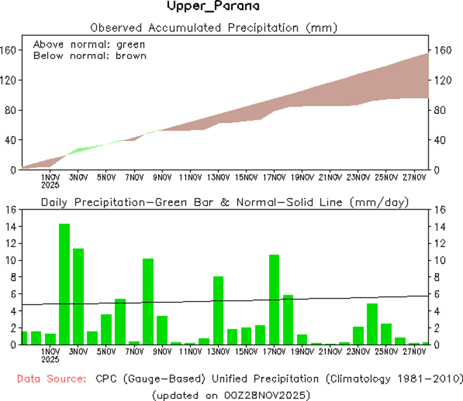 El fenómeno de El Niño-Oscilación del Sur (ENSO) se mantiene neutral, pero hay indicios de que podría estar desarrollándose La Niña. El último valor relativo del índice Niño3.4 de temperatura superficial del mar (TSM) para la semana que finaliza el 9 de noviembre de 2025 es de −0,84 °C. Valores sostenidos por debajo de −0,8 °C son consistentes con un patrón de La Niña. Los valores semanales del índice Niño3.4 relativo han fluctuado en torno al umbral de La Niña desde mediados o finales de septiembre.