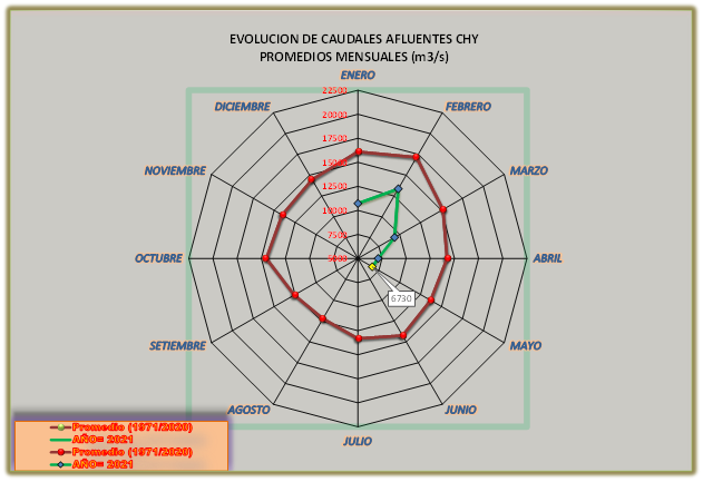 El caudal afluente a la CHY diario, pronosticado para la fecha de hoy es de 6.700 m3/s, y para el día de mañana se espera una afluencia del orden de 6.600 m3/s.