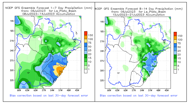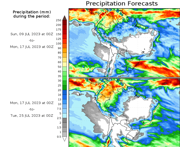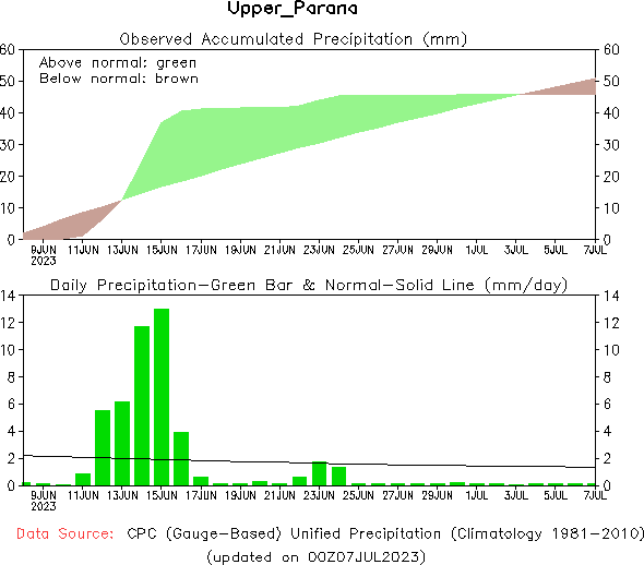 El pronóstico Hidrometeorológico del Centro Climático de referencia indica una tendencia semanal de poca significancia hidrológica en la cuenca de interés para la CHY con dispersión geográfica según sea la fuente consultada. (Ver gráfico Nro. 1).