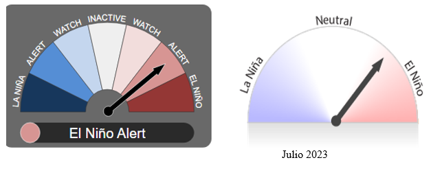 La Perspectiva ENSO está en Alerta El Niño. Cuando los criterios de Alerta de El Niño se han cumplido en el pasado, un evento de El Niño se ha desarrollado alrededor del 70% del tiempo.