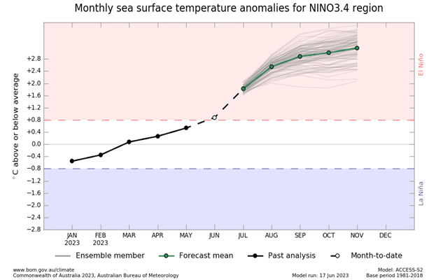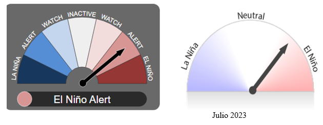 La Perspectiva ENSO está en Alerta El Niño. Cuando los criterios de Alerta de El Niño se han cumplido en el pasado, un evento de El Niño se ha desarrollado alrededor del 70% del tiempo.
